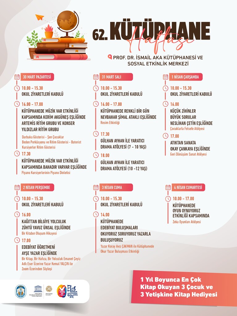 Hafta boyunca her gün 10.00 – 15.30 saatleri arasında okulların kütüphane ziyaretleri kabul edilirken, etkinlik programı farklı yaş gruplarına yönelik atölye ve söyleşilerle zenginleşecek.