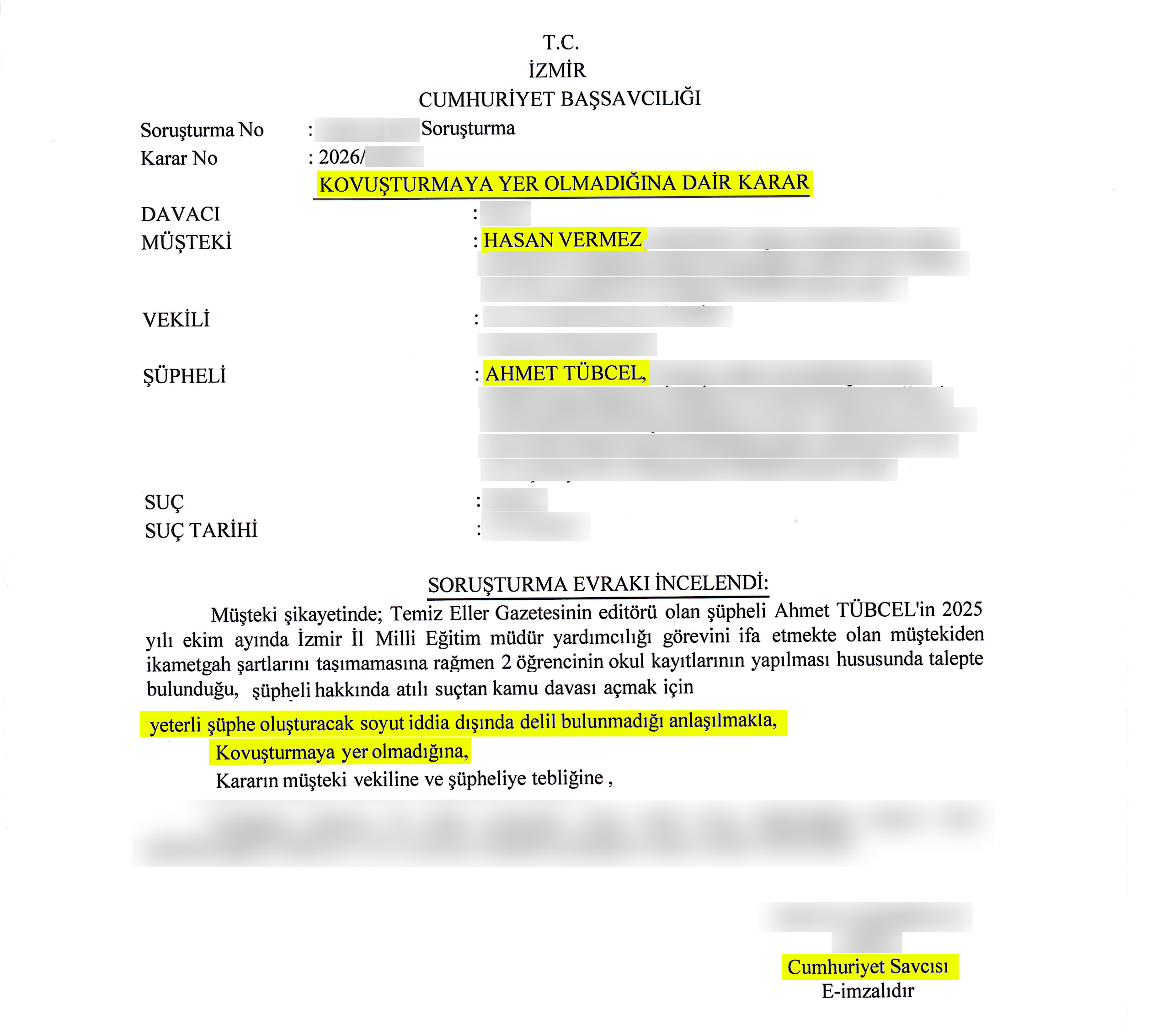 Bu dosya, başından itibaren içi doldurulamayan iddiaların devletin okuluna iki öğrenci kaydı gibi sınırlı bir konu üzerinden köpürtülerek kamuoyuna servis edilmesinden ibaretti. Savcılığın verdiği karar, İzmir İl Milli Eğitim müdür yardımcısı Hasan VERMEZ ’in kurgulamak istediği senaryonun hukuk karşısında nasıl paramparça dağıldığını açık biçimde ortaya koymuştur.