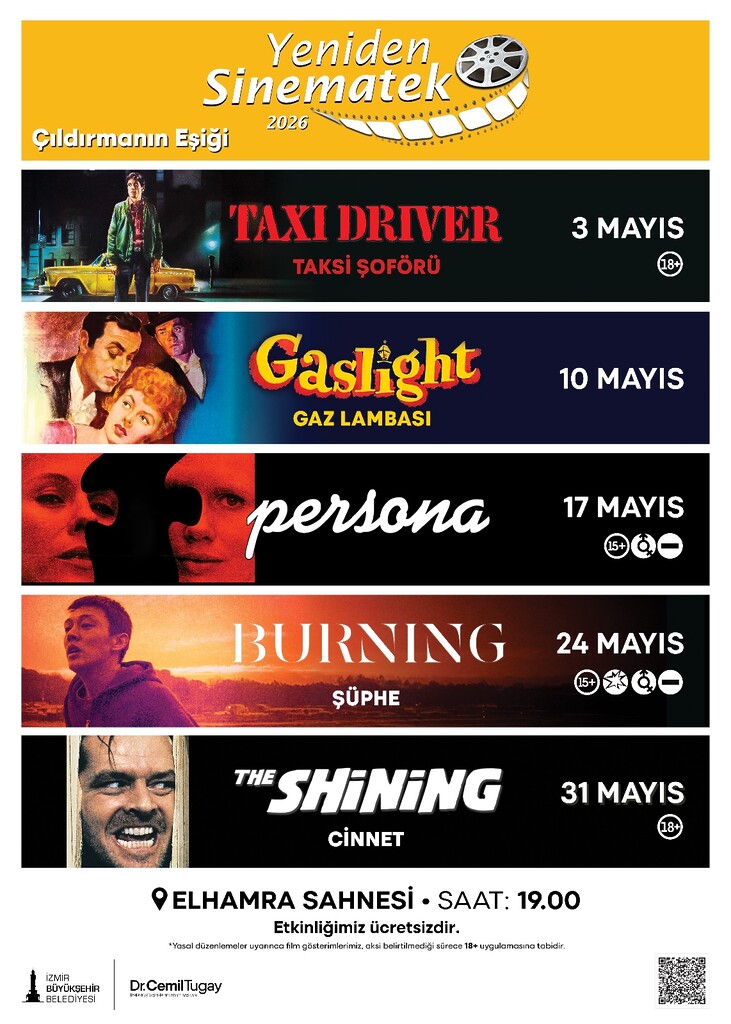 İzmirli sinemaseverleri dünya sinemasının unutulmaz yapımlarıyla buluşturan İzmir Büyükşehir Belediyesi Yeniden Sinematek gösterimleri, mayıs ayında “Çıldırmanın Eşiği” temasıyla dikkat çekiyor. Uçlarda gezen karakterlerin derinlikli hikâyelerini beyazperdeye taşıyan seçki, Elhamra Sahnesi’nde izleyiciyle buluşacak. Program kapsamında her pazar gösterilecek filmler arasında Taksi Şoförü, Gaz Lambası, Persona, Şüphe ve Cinnet yer alıyor. Sinemaseverleri güçlü anlatımlar ve özgün hikâyelerle buluşturacak programda, film gösterimlerinin yanı sıra alanında uzman akademisyenlerin katılımıyla tema ve filmler üzerine söyleşiler de gerçekleştirilecek.